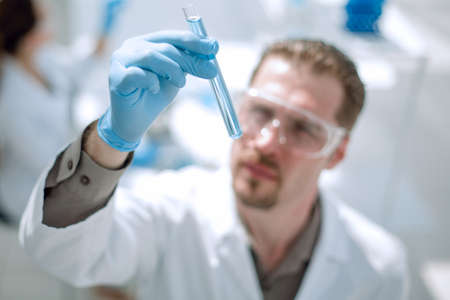 Male scientist looking at test tube containing blue liquid