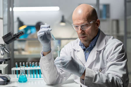 Mature experienced scientist in protective workwear mixing two chemical substances in flask while sitting by workplace in laboratory