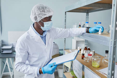 African male doctor in protective mask and white coat working with analysis on the shelves and making notes in the card
