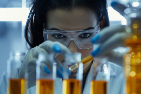 Close up female scientist looking at ampoule with new medication. AI generative
