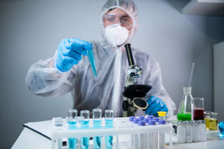 Covid-19, Vaccine development, pandemic, outbreak and coronavirus concept - Man scientist dressed personal protective equipment holding a test tube and does a chemical experiment.