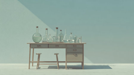 Clear glass containers filled with liquid are neatly arranged on a wooden desk in a well-lit interior space, highlighting a minimalist atmosphere.