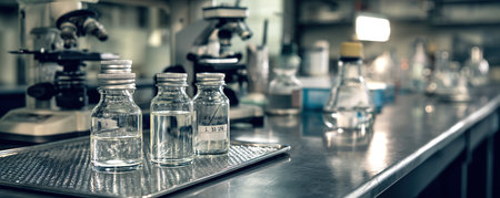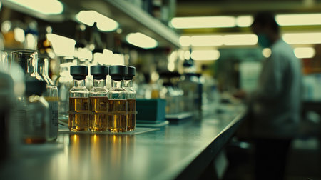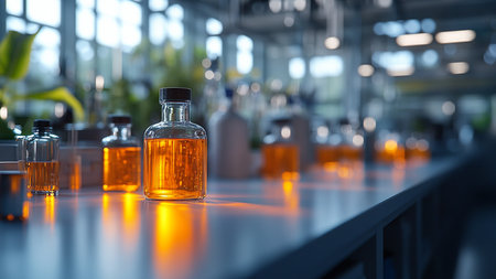 A laboratory workspace showcases glass bottles filled with amber liquid, highlighting scientific research and experimentation in a sterile environment.