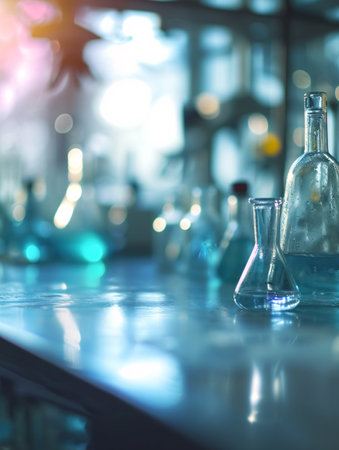 Laboratory glassware and chemical liquids in a modern scientific laboratory.