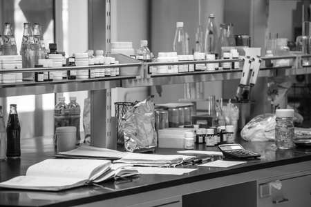 Blurred abstract background of untidy workbench in chemistry laboratory