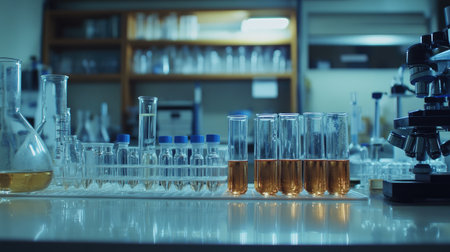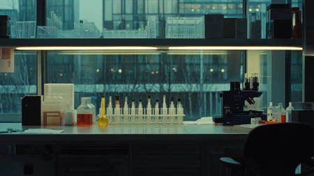 A scientific laboratory setting with microscopes, glassware, and vials, conveying research, analysis, and experimentation.