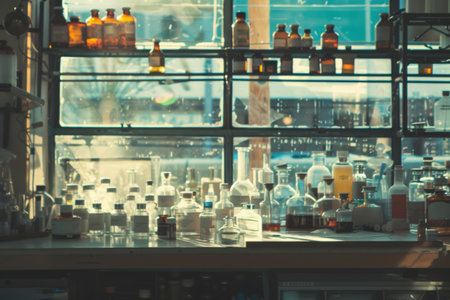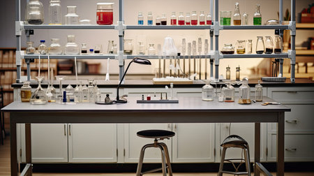 A modern and well-equipped chemistry laboratory with numerous chemical bottles, glassware, and scientific apparatus, set in a bright, orderly space.. AI Generation