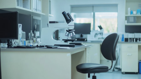 A well-organized laboratory is equipped with glassware and a microscope, illuminated by natural light streaming through large windows, showcasing a productive research environment.