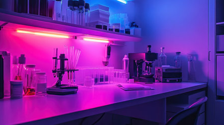 Modern laboratory setup with a central microscope, illuminated workstations with purple lighting, and a large window showcasing city buildings at night. Clean and organized workspace.