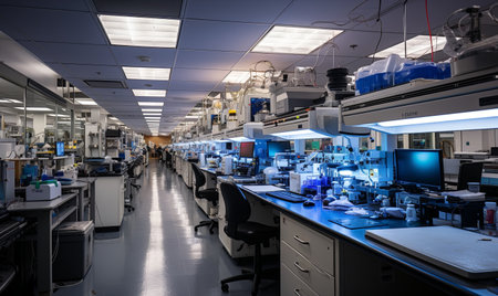 A modern science laboratory filled with various scientific instruments, microscopes, and complex equipment on workbenches.