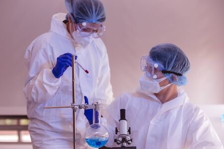 Two young men scientist using a microscope for looking solution in corona virus Laboratory in a chemical laboratory room.