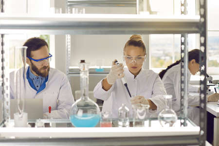 Young female student intern taking sample with pipette standing at worktable. Male scientist supervisor controlling workflow process. Front view shot. Medical, biotechnology chemical laboratory