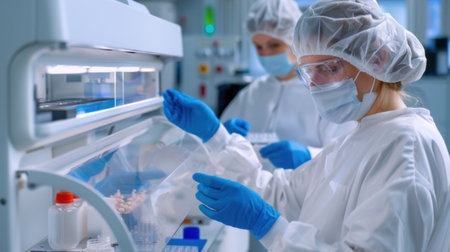Two medical scientists in protective wear hadling test tubes in a laboratory