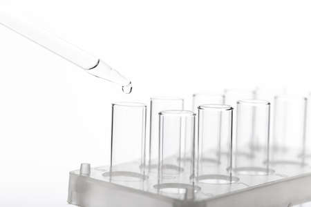 scientist with equipment and science experiments, laboratory glassware containing chemical liquid for research or analyzing a sample into test tube in laboratory isolate on white background