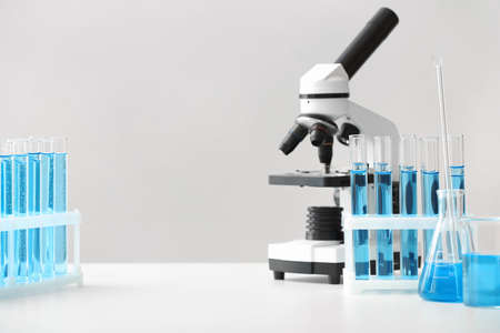 Research laboratory. Test tubes and microscope on the table on a white.