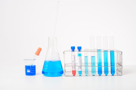 Laboratory glassware with blue liquid in a test tube. scientific laboratory flasks, droppers, Petri dishes, beakers and cylinders, laboratory equipment