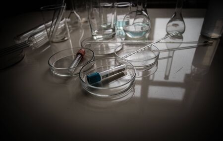Petri dishes, test tubes and laboratory equipment, with coloring liquids. Concept of science, laboratory and study of diseases. Coronavirus (COVID-19) treatment developing.