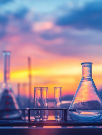 Laboratory equipment including flasks and test tubes stands illuminated by a vibrant sunset in the background, showingcasing research activity.