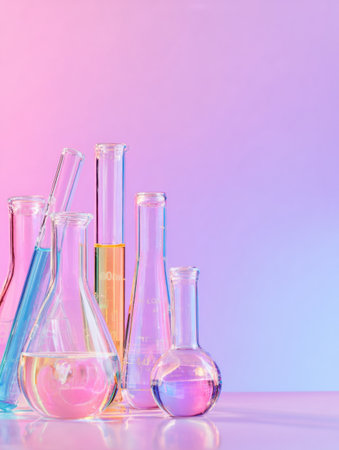 Laboratory glassware displays various liquids, reflecting vibrant colors against a soft pastel backdrop, emphasizing creativity in scientific research.