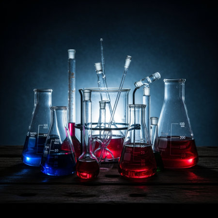 Laboratory glassware with colored reagents, sunlight and shadows.