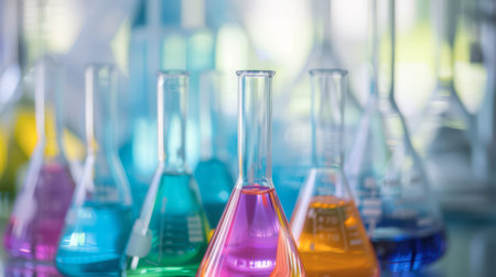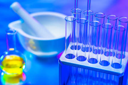 Laboratory theme. Laboratory experiment. Test tubes. Scietific lab concept. Colorful bokeh.