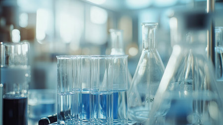 close-up of beakers and test tubes in a science lab, created with generative ai