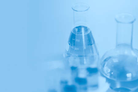 Breaker and glassware in Chemical laboratory. Analysis of Science, biological medical, research and development concepts