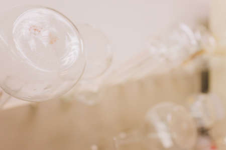 Close up of labware such as beaker, flask, graduated cylinders and test tubes well placed