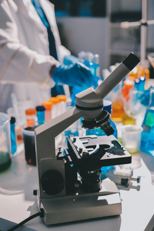 Microscope and test tube in laboratory, science research and development concept