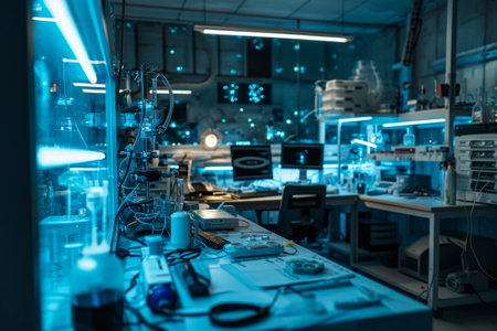 An electronic circuit board and various components are showcased, illuminated by a combination of red and blue light. The image highlights a complex arrangement of wires, panels, and equipment, indicating a possible laboratory or workshop setting. This composition may be suitable for illustrating technology, innovation, or research concepts in commercial contexts.
