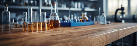 Empty science laboratory test tubes on a sterile bench, surrounded by chemical equipment. Ideal for research purposes.
