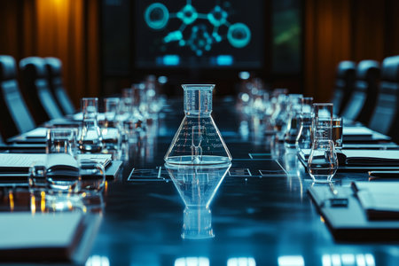 Sleek meeting table with scientific tools and business executives discussing innovative strategies