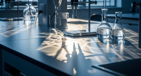 Captivating view of a well-organized laboratory featuring glassware, instruments, and a wooden counter, illuminated by natural light through large windows, ideal for research.
