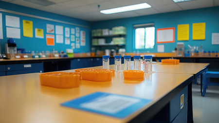 A vibrant laboratory space showcasing test tubes and research supplies, designed for effective scientific experimentation and learning, enriched with colorful wall decor.