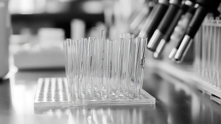 Empty science laboratory test tubes on a sterile bench, surrounded by chemical equipment. Ideal for research purposes.