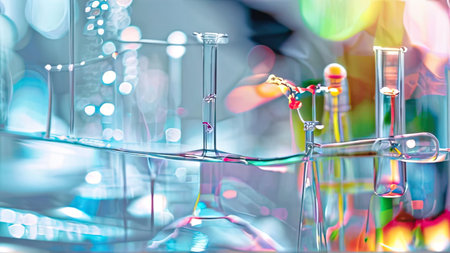 Laboratory glassware with colorful bokeh background, science research and development concept