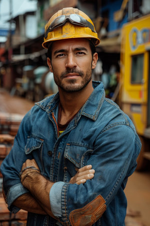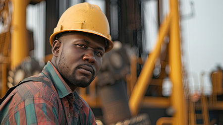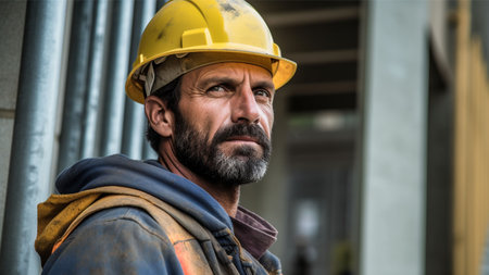 Close-up of an experienced construction worker with a yellow hard hat and stern expression