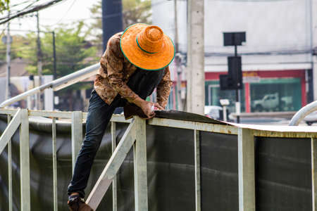 Close up of concrete mixer truck driver inspecting mixture before pouring in construction scene