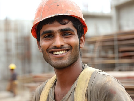 A smiling Indian male construction worker standing in construction site. Generative AI AIG19.