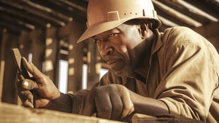 Construction Worker Male African-American Mature Using tools to build a house in Construction site. Generative AI AIG22.