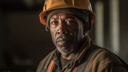 Portrait of an African American construction worker in a hard hat and safety vest after a hard day of work. Manual labor concept