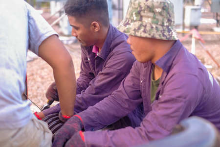 Bucharest, Romania - May 14, 2020: Asian construction workers on a construction site in Bucharest.