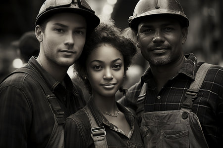 Construction workers in helmets and workwear are smiling and posing for a picture, happy in a community