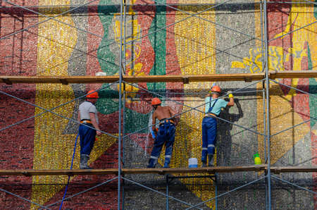 Two workers stands high on the scaffolding, plastering and renovating the wall on the old utility building