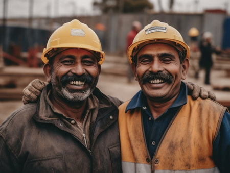 A group of cheerful construction workers wearing safety helmets and clothing, standing together on a building site, embodying teamwork and positivity.