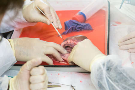 students of surgeons make seams on the open heart. Hands in medical gloves. details of a close-up operation.