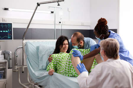 Young woman giving birth to child in hospital ward maternity with assistance from doctor and african american nurse. Multi ethnic medical team helping pregnant adult with baby delivery