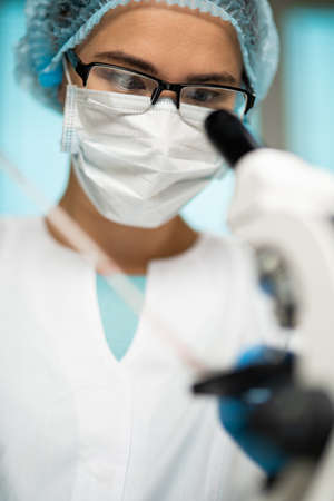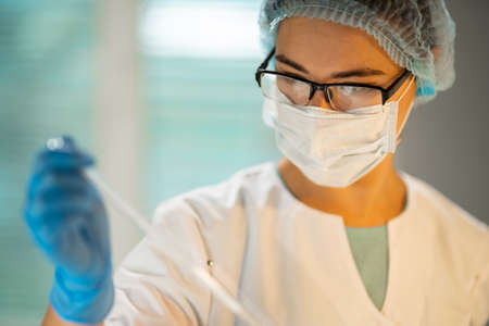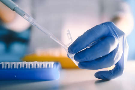 Hand of an unidentified laboratory assistant in protective clothing squeezes the tests using a special pipette onto the microscope glass. The concept of a modern high-tech medical laboratory