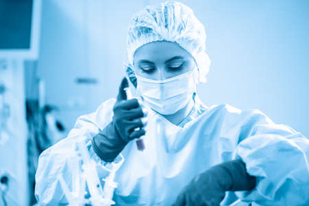 Nurse doctor preparing surgical equipment for operation inside emergency hospital room - Focus on female face
