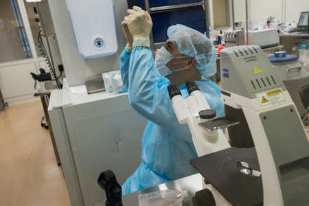 Saint-Petersburg, Russia - November 16, 2016: A member of the laboratory of department of Advanced Studies biotech companies Biocad at work at the microscope behind glass in a sterile clean room
